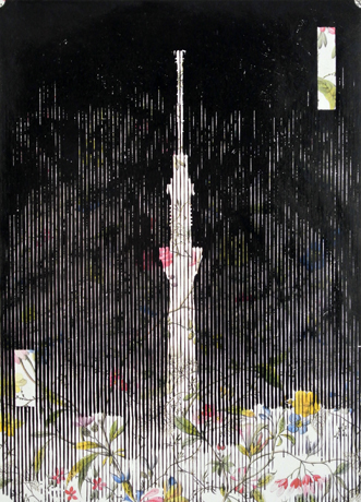 Eight new famous views in Tokyo #1 / 29.7cmx21cm / Oil-based woodcut on flower-printed paper