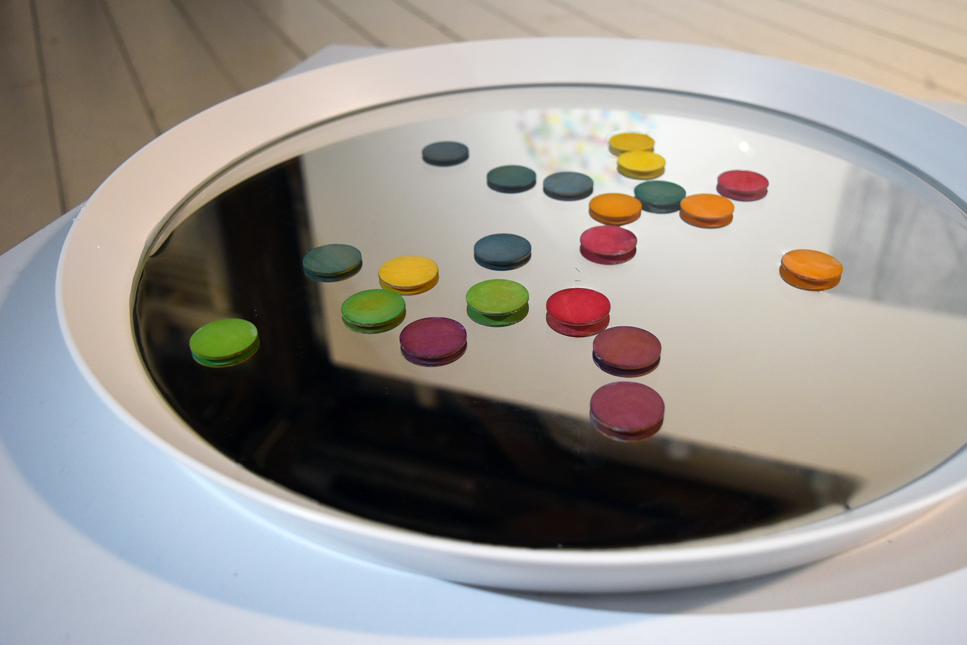 Something like a pond of material in various flows and waves / 50cm in diameter x 5cm / Mirror, wood chips and water